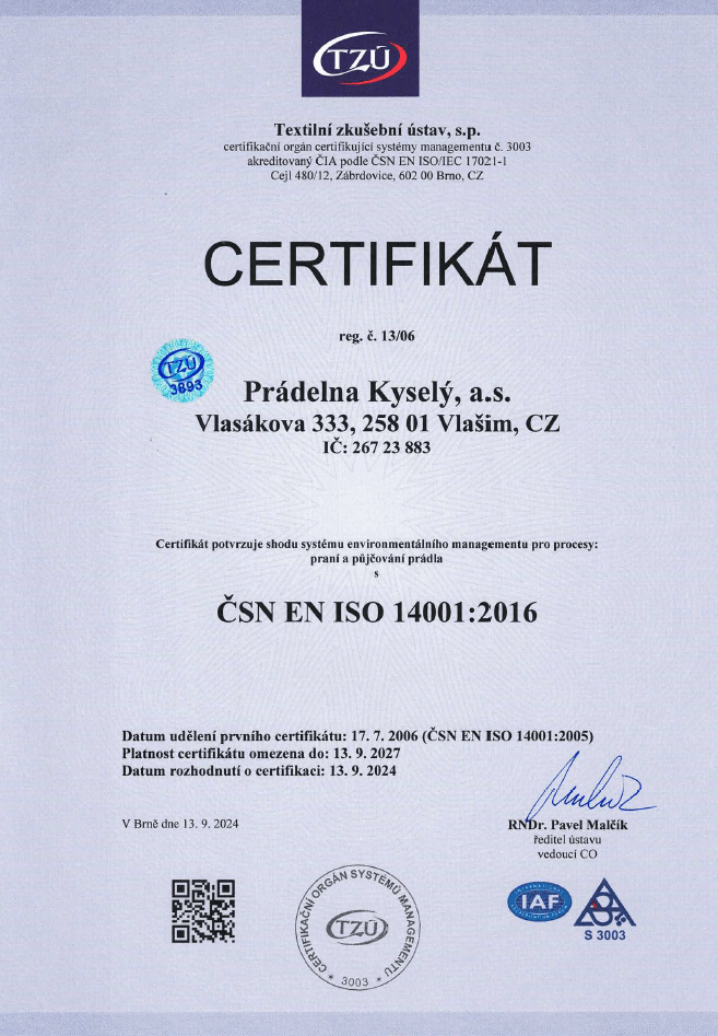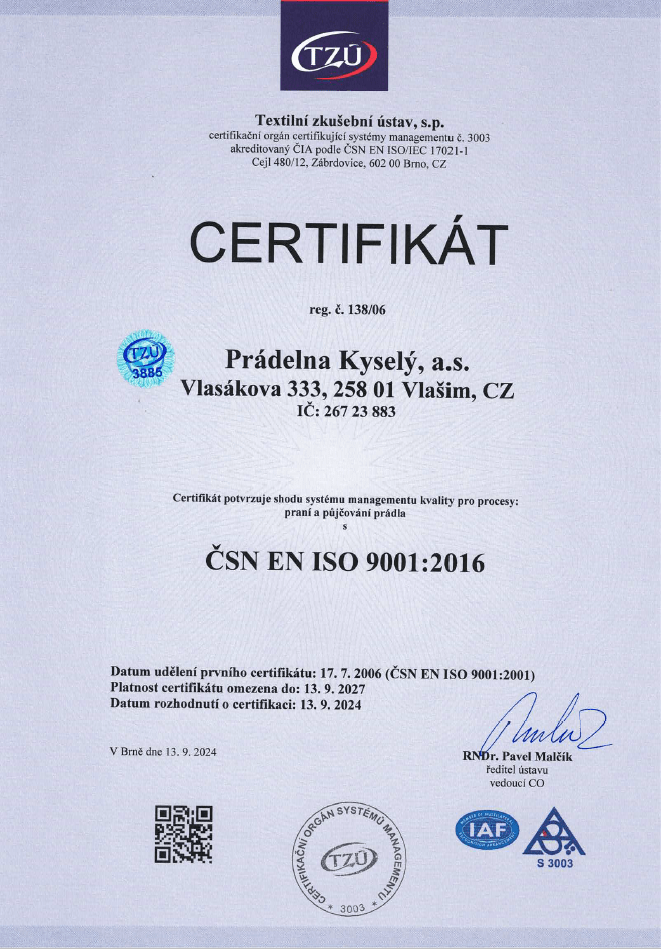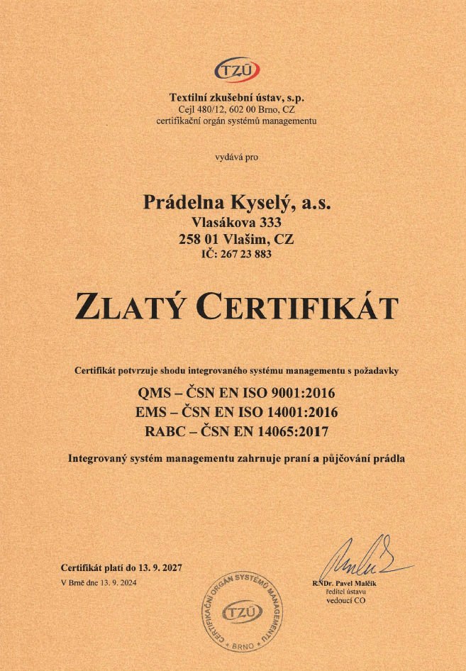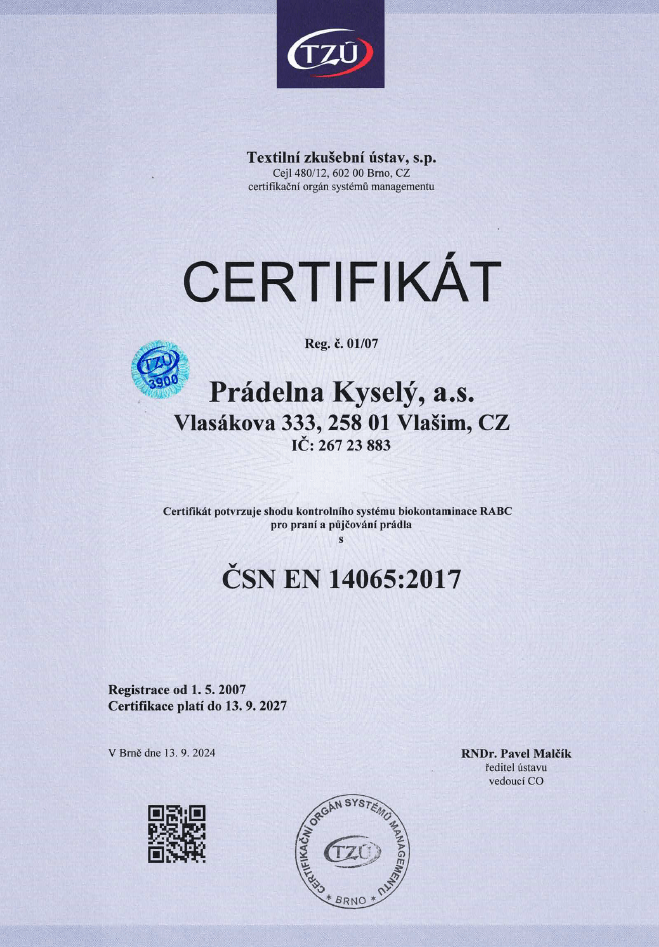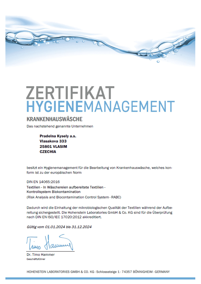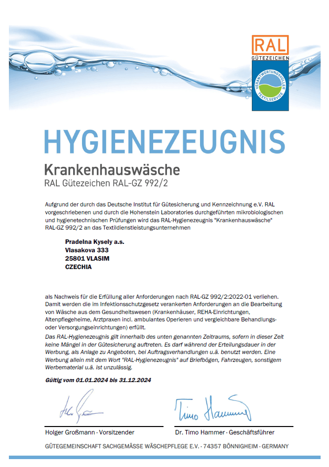Jsme držitelem HYGIENICKÉHO CERTIFIKÁTU RAL-GZ 992/2:2019, který garantuje dezinfekční praní dle německé hygienické normy RAL a prokazuje splnění přísných požadavků pro praní prádla. Certifikát je vždy udělován pouze na období jednoho roku a jedná se vůbec o nejpřísnější hygienickou normu v celé Evropě. Mimo to musíme dodržovat veškeré předepsané podmínky pro praní prádla, zvláště pak splňovat oborovou specifikaci OS 80-01 vydanou Textilním zkušebním ústavem v Brně.